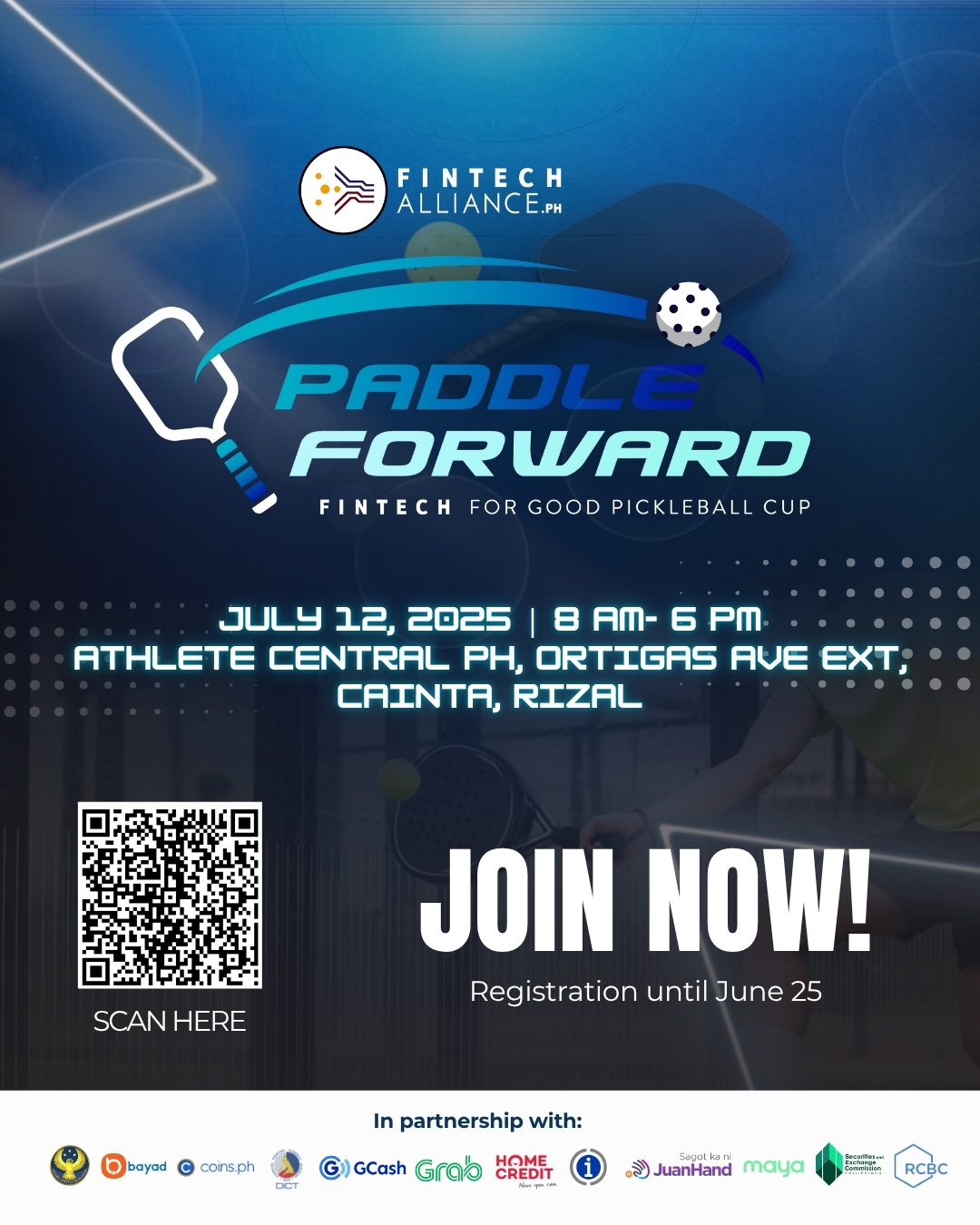 Get ready to rally for a cause at Paddle Forward: Fintech for Good Pickleball Cup, hosted by Fintech Alliance.PH! Happening on July 5, 2025 (Saturday) at 9:00 AM at Dink & Shot in Marikina City, this exciting event brings together fintech professionals and enthusiasts for a day of fun, friendly competition, and social impact. Open to all skill levels, Paddle Forward is more than just a game—it’s a movement to drive positive change through sport. Register by June 15 and be part of this dynamic community initiative. Scan the QR code to join now!